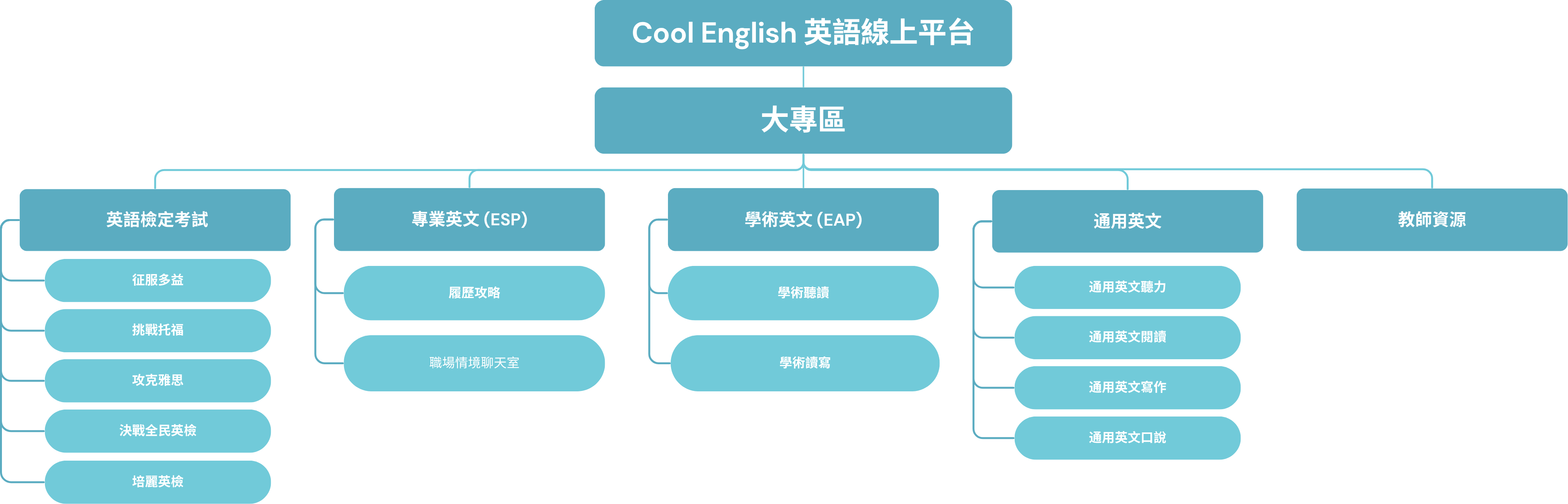 「Cool English英語線上學習平臺」國中小專區,以聽力、口說、閱讀、寫作、字彙/文法、遊戲、學習扶助內容及會考專區進行課程規劃,多元豐富的內容培養學生全方位的英語能力。因應行動載具普及化,Cool English 也特別研發行動載具可使用之課程,透過手機或平板電腦即可隨時隨地體驗互動式課程,讓數位學習不再侷限桌機及筆電。